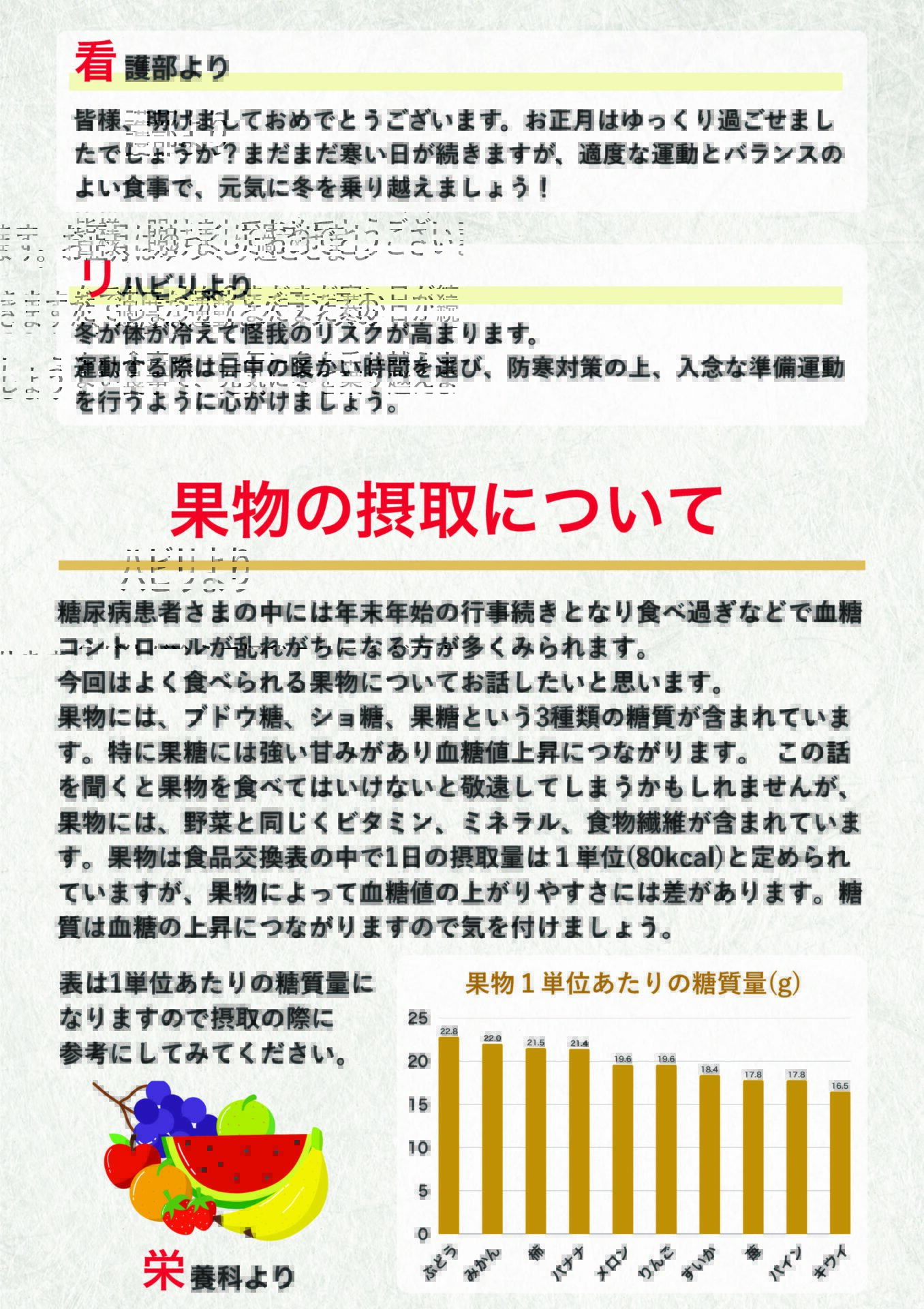 SD糖尿病センターでは病態栄養科から月1回、糖尿病や食事に関する情報を掲載した「ふれあい通信」を発行しています。
