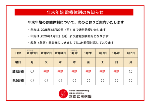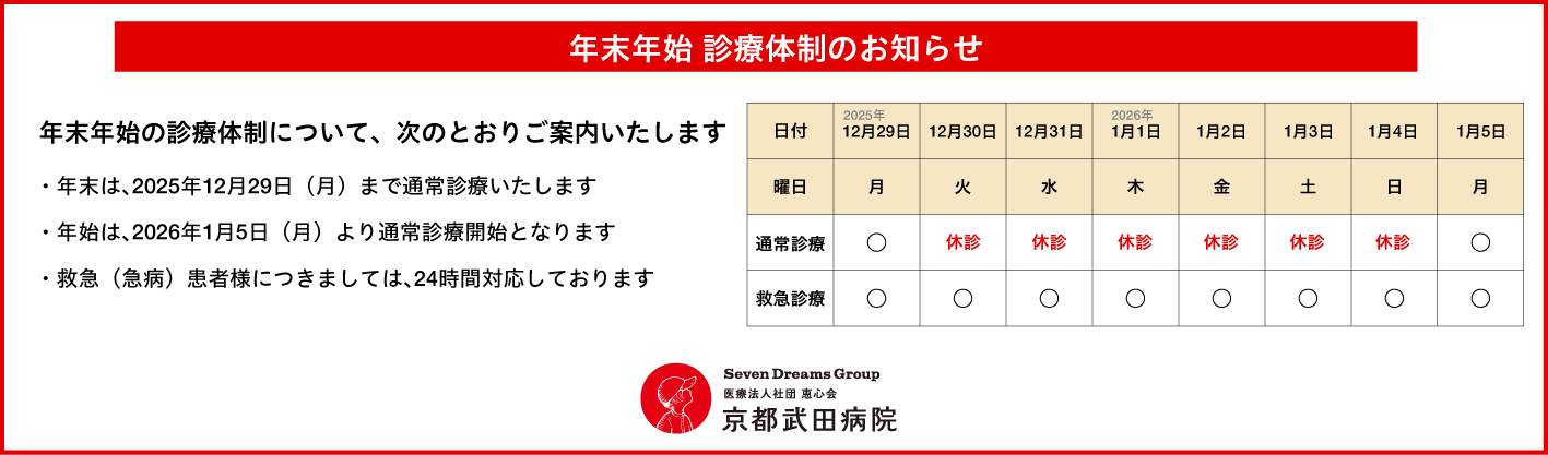 京都武田病院で実施する「健康診断」では、高度な医療技術により法定の項目はもちろん、多彩なオプションにより皆様の健康をサポートします。健診にて異常がみられた方のフォローも万全です。 詳しくみる