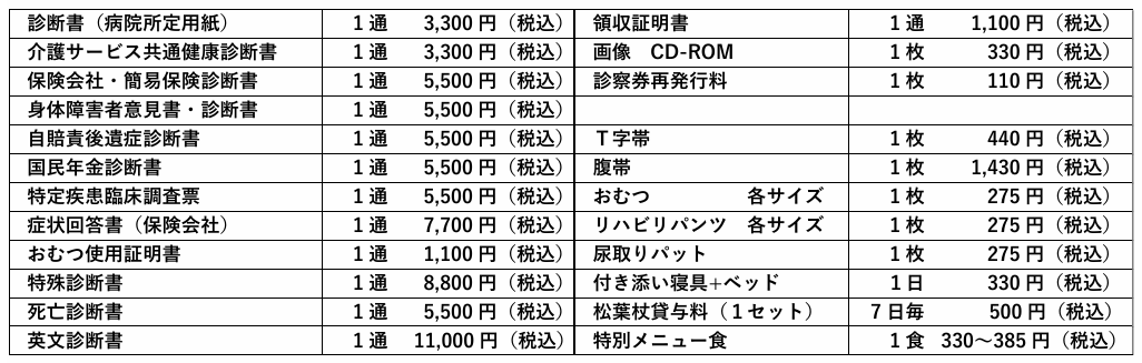 当院は、健康保険法に定める規定に基づいた療養環境の向上に努めております。 以下の病室への入室を希望される場合には、1日につき次の室料差額が必要になります。 ご希望の方は入院の際にお申し出ください。