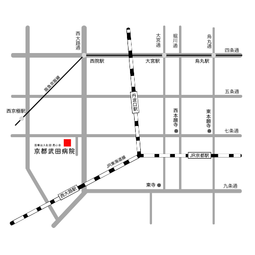 - 市バス 33系統 「京都駅ゆき」 西大路七条下車 徒歩3分
