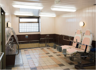 また、院内に大きな浴室設備があり、個室のシャワー浴室が毎日使えます。個人用浴室ではリハビリの一環として浴槽を使って入浴する練習ができます。また、立位保持が不安定な場合は浴室用車椅子に乗り換えて、そのまま大浴室でシャワーや入浴をしていただけます。人工関節術後の患者様には関係がありませんが、身体の状態が不自由な方は入浴用リフトを用いて浴槽へ入ることもできます。浴室には浴室職員が大勢常駐し、必要に応じて介助いたします。