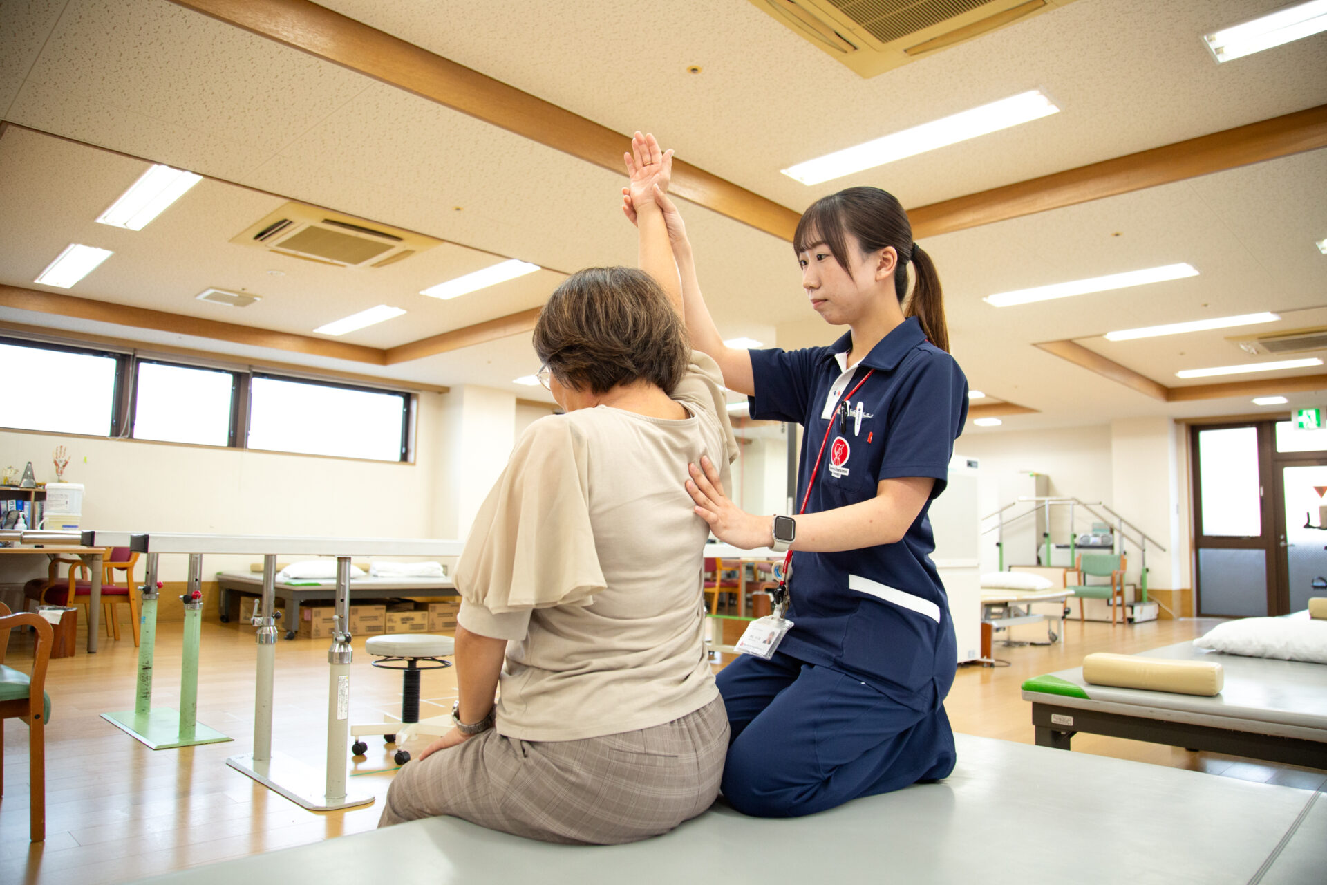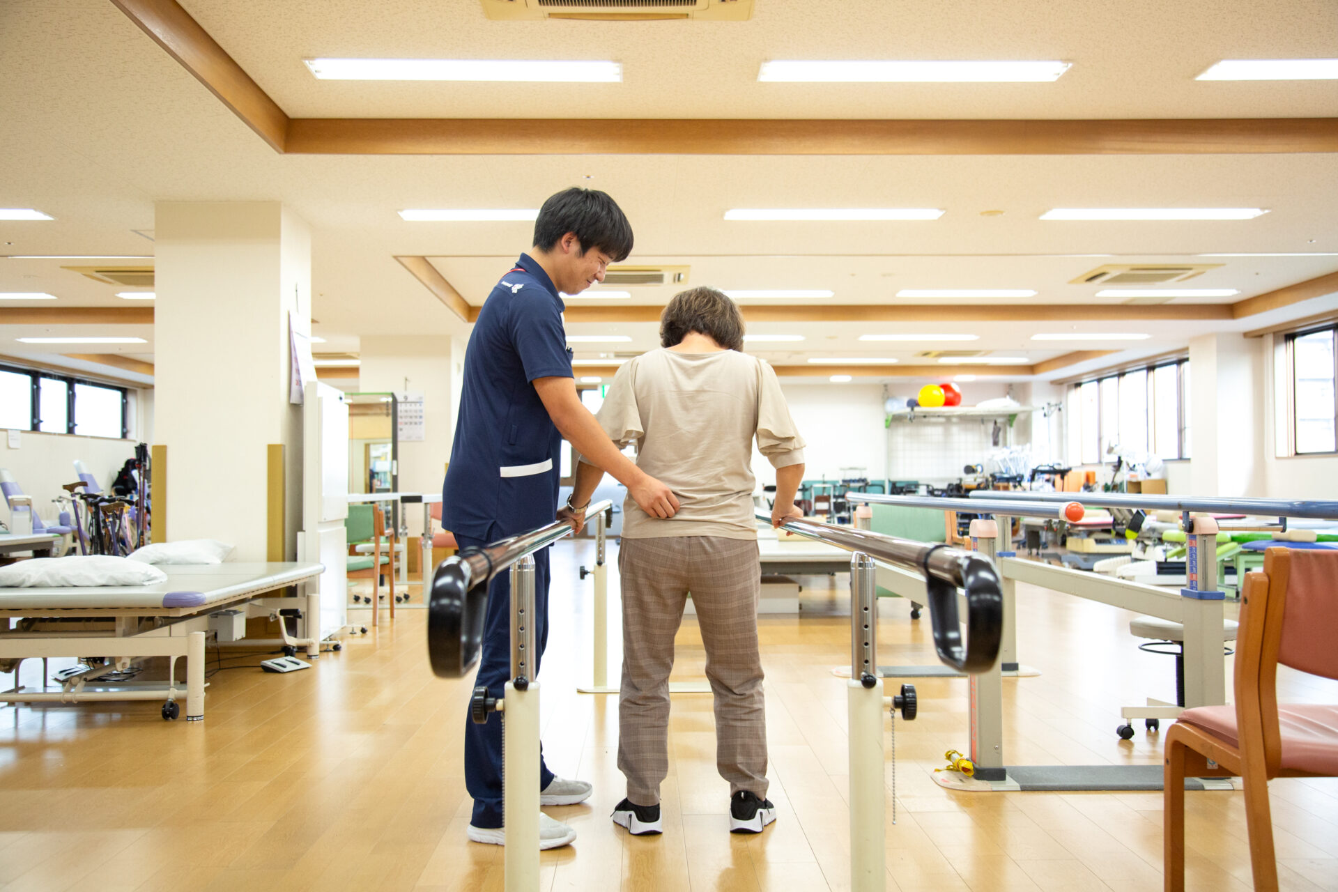 低侵襲手術を行っているため手術翌日には歩行器での歩行が可能で、理学療法室では平行棒内での歩行訓練を開始できます。手術前に杖を使っていなかった方は術後も杖を使う必要はなく、歩行器で訓練を行ったあとは1週間程度で独歩で歩けるようになります。その後、体力に応じて階段や蒲団の上げ下ろしなどの日常生活動作の訓練を進めます。病院外の路上歩行訓練も行います。そして、問題がなければ術後10日~3週間で歩いて退院できます。階段昇降はもちろん可能ですし、自転車にも乗れます。膝が悪くなければ正座も充分可能です。ゴルフや社交ダンス、ウォーキングなどのスポーツやレクリエーションも楽しんでいただけます。