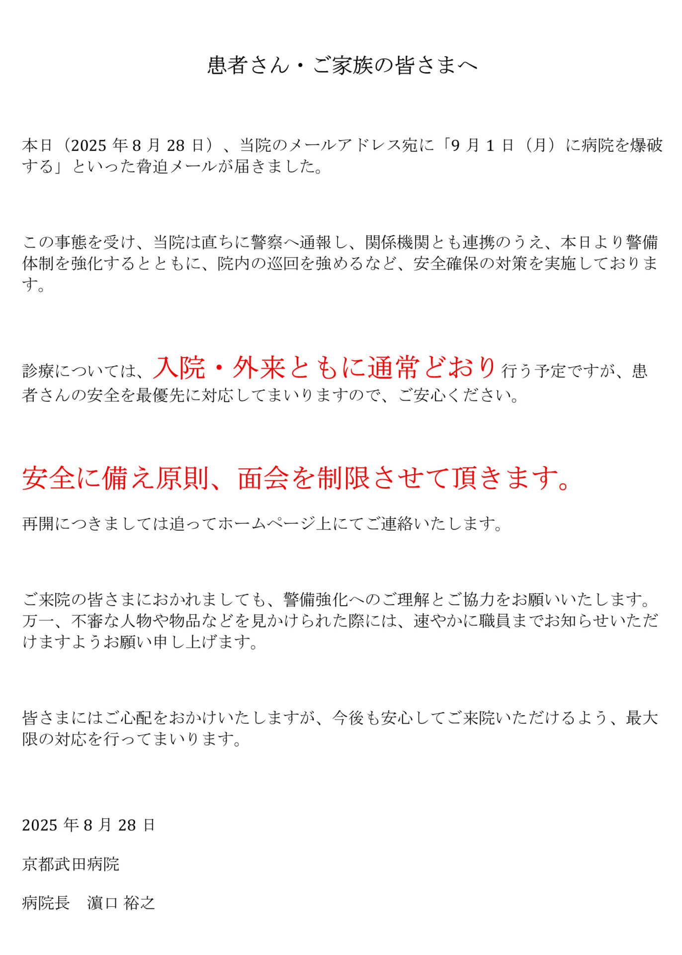 当院に対する爆破予告についてのお知らせ