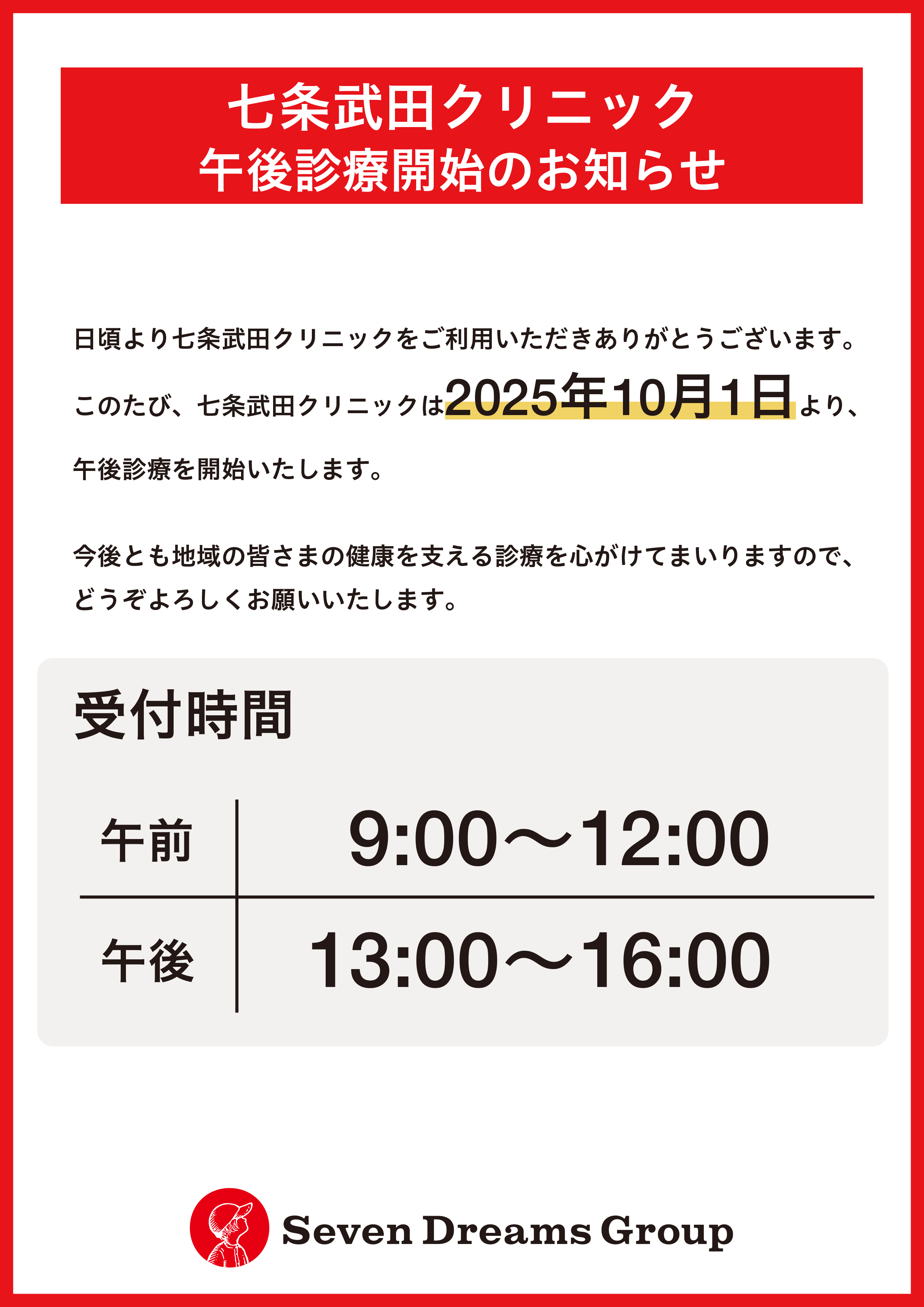 七条武田クリニック 午後診療開始のお知らせ