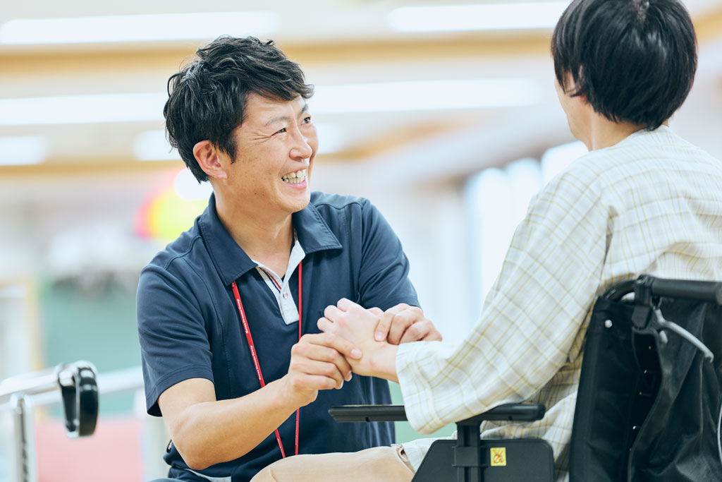 総合リハビリテーションセンターでは、各分野の専門家が「リハビリテーションチーム」を形成し、連携しながら治療を行います。当センターでは実践的な教育システムに加えてモチベーションを高くもって自己研鑽を行う風土があり、患者様およびご家族様に対して丁寧かつ元気に、フットワーク軽く対応できるよう心がけています。若いフレッシュなスタッフが一人一人の患者様 にじっくり&しっかりアプローチすることで「Re Life」をサポートします。