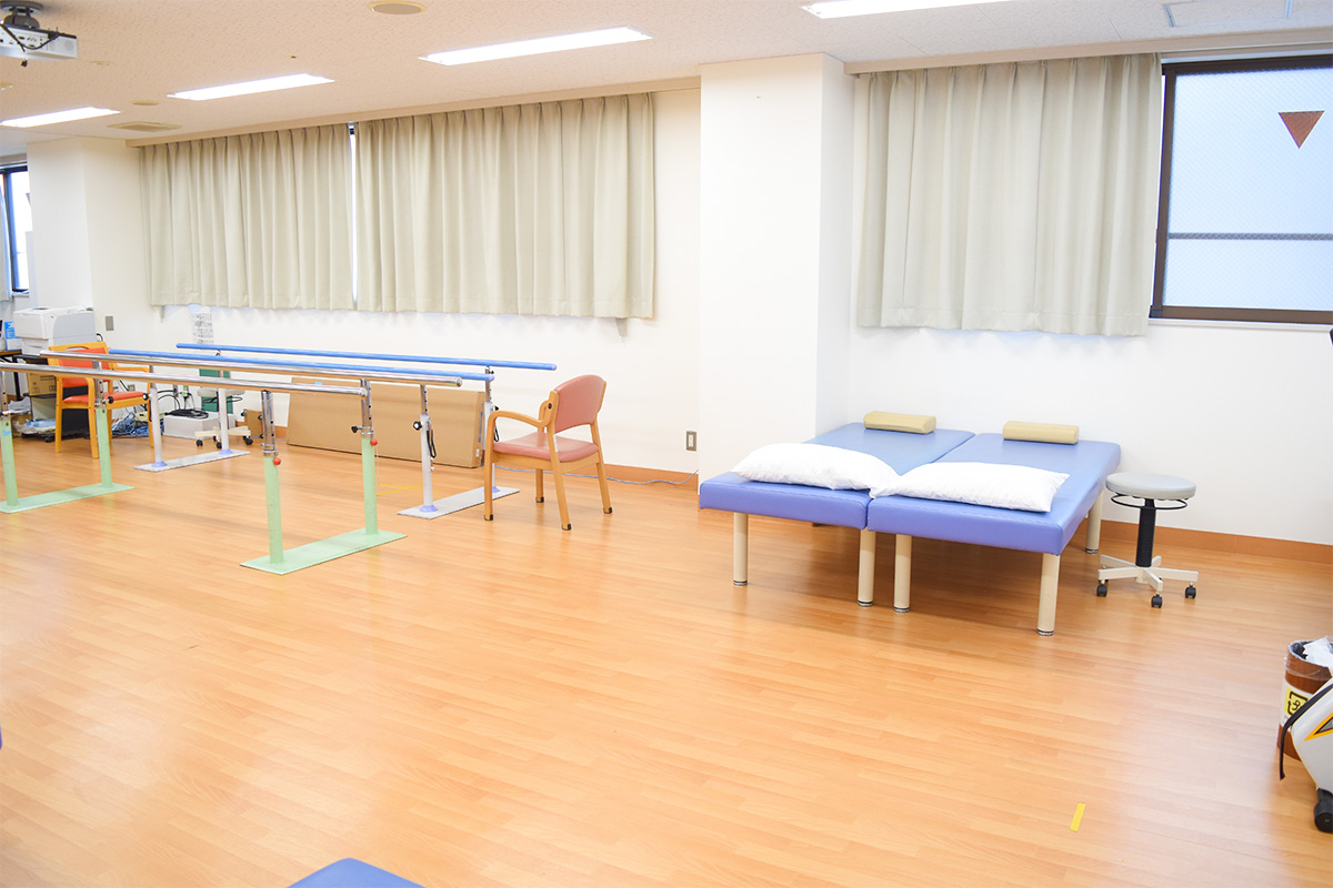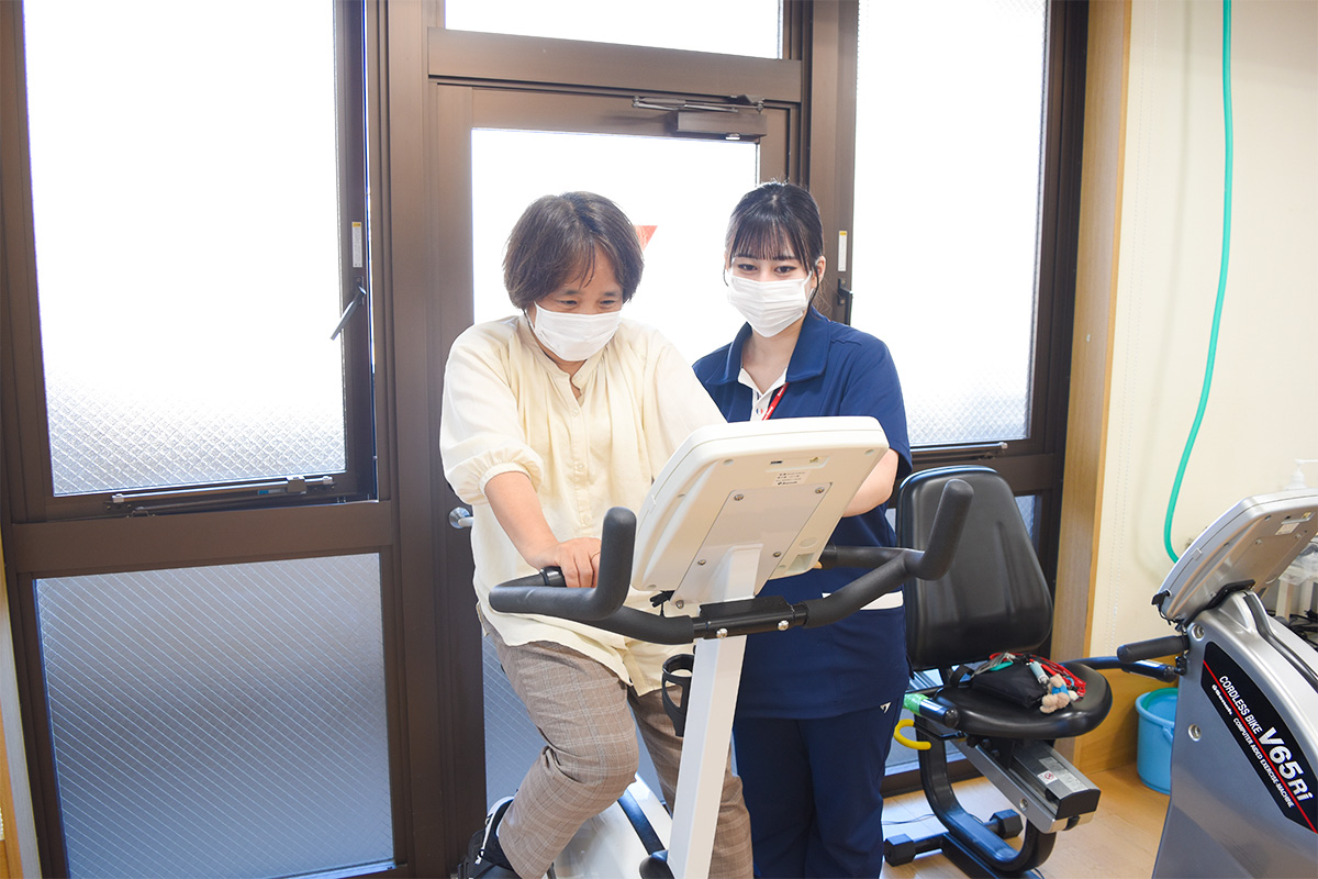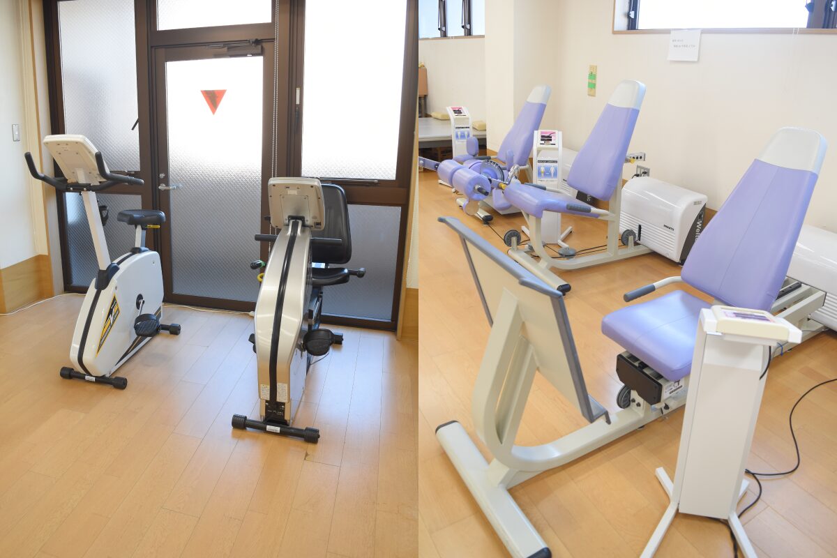 総合リハビリテーションセンターは4階にあります。日光が差し込む、明るく広い理学療法室では充実したリハビリを行うことができます。単なる運動療法だけではなく退院後の生活を見据えた職業復帰訓練や、スポーツ活動を目標としたリハビリも行っています。自転車に乗りたい方には自転車エルゴメーターおよび実物の自転車を用いた練習を行うことができます。