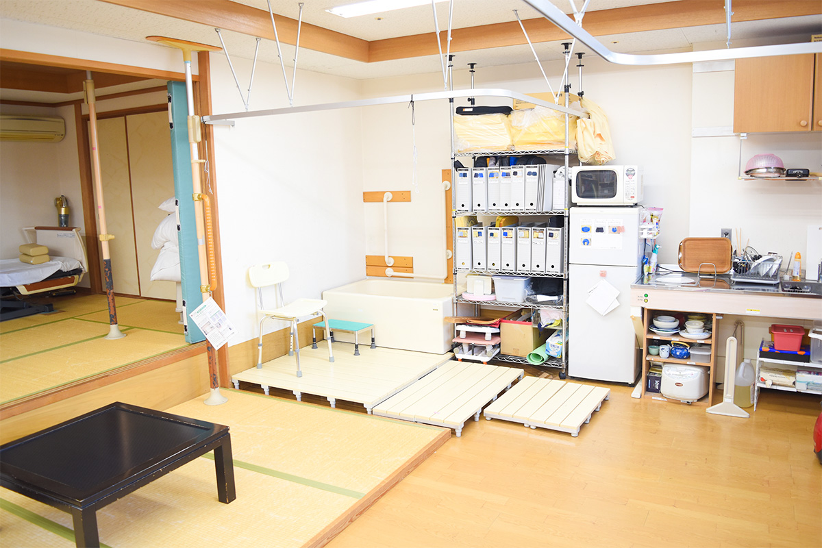作業療法室には畳、キッチン、浴槽、洗濯機などが配置され、在宅生活を想定して和室における正座のやり方や蒲団の上げ下ろし訓練、浴室内の動作などを練習していただきます。